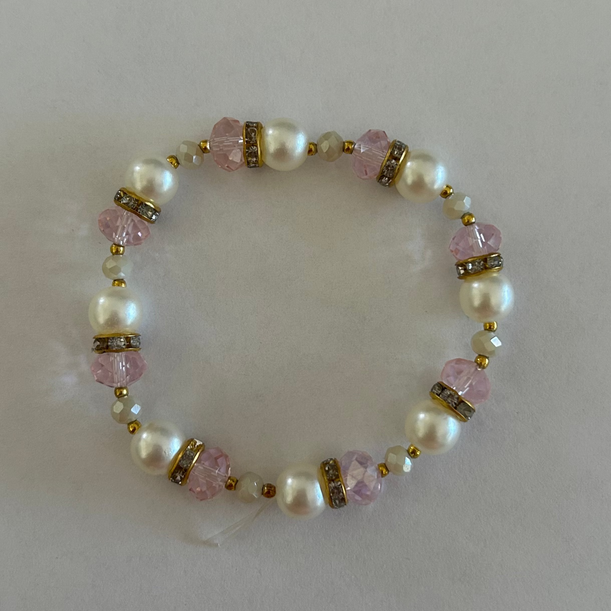 Pink and gold glass beaded pearl bracelet, 7in